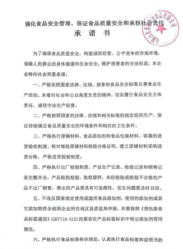 強(qiáng)化食品安全管理、保證食品質(zhì)量安全和承擔(dān)社會責(zé)任承諾書